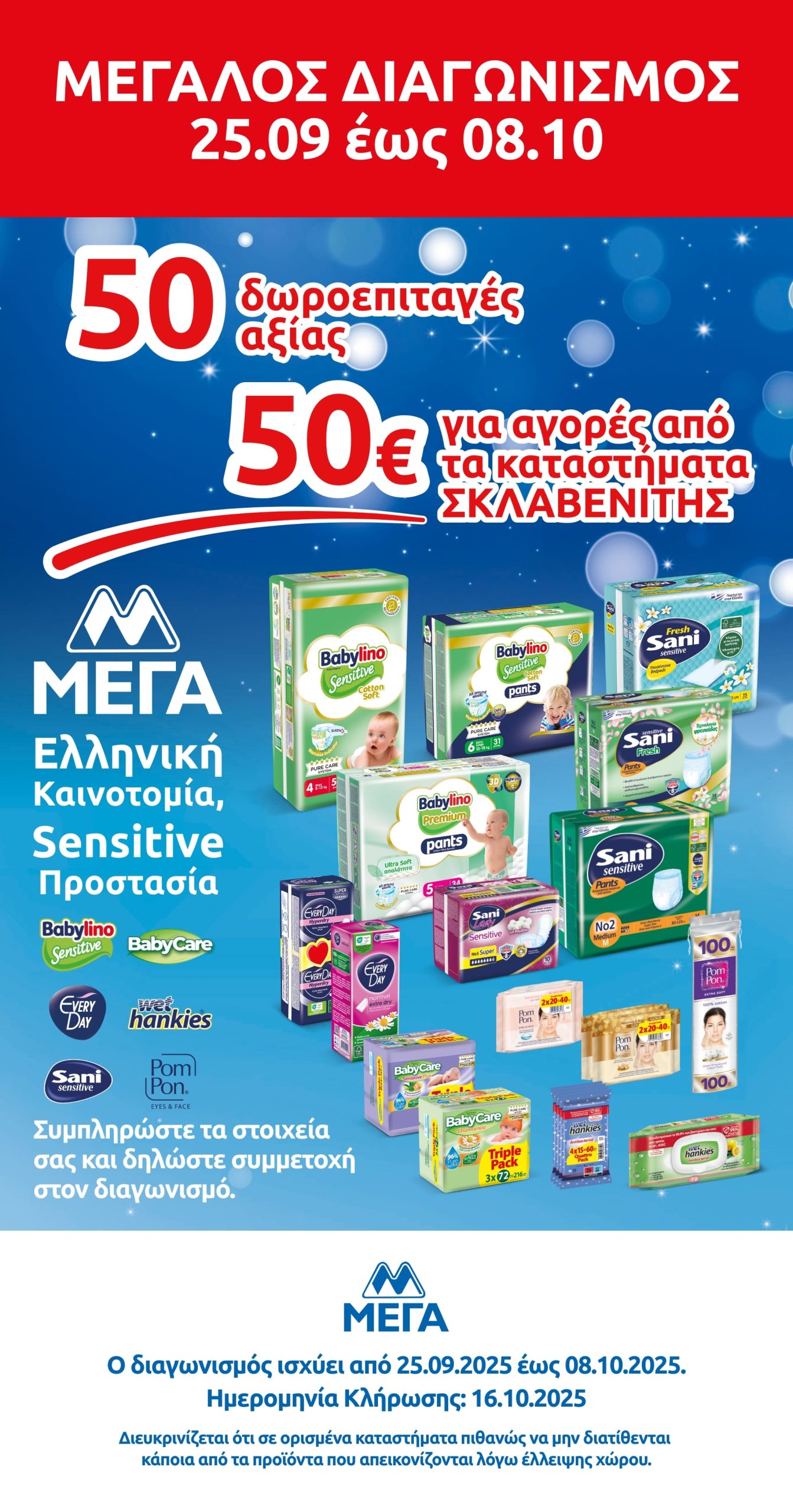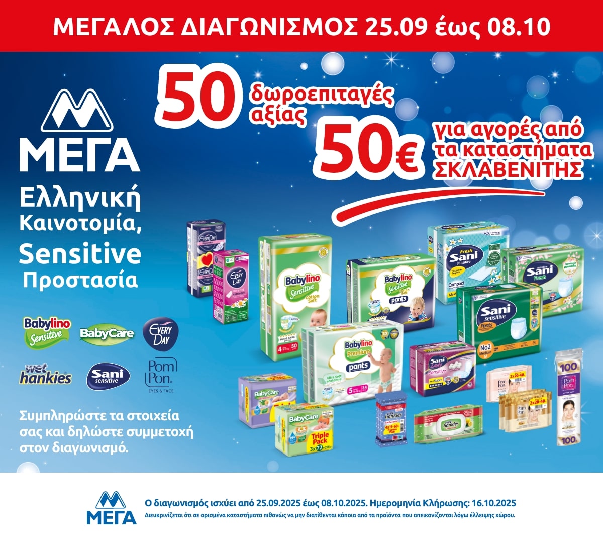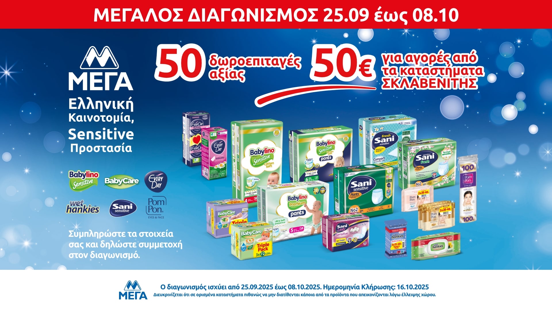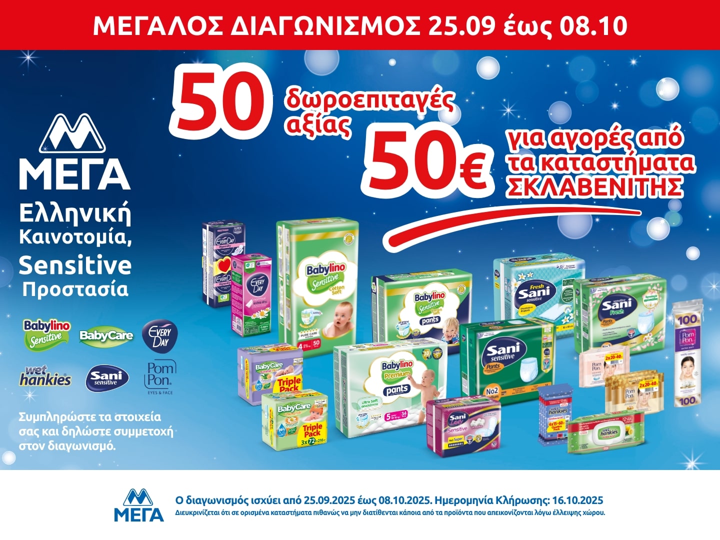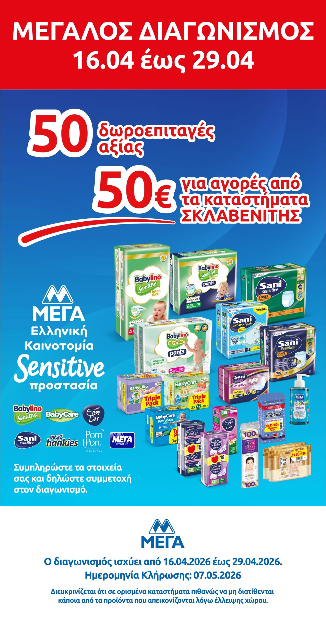 Η εταιρεία «ΜΕΓΑ ΠΡΟΪΟΝΤΑ ΑΤΟΜΙΚΗΣ ΥΓΙΕΙΝΗΣ Α.Ε.» (η «Διοργανώτρια»), η οποία εδρεύει στην οδό Δεκελείας, αρ. 148, Αχαρναί, Τ.Κ. 136 78, όπως νόμιμα εκπροσωπείται, με την υποστήριξη της εταιρείας «MULLENLOWE ΕΠΙΚΟΙΝΩΝΙΕΣ ΜΟΝΟΠΡΟΣΩΠΗ ΑΕ» (η «Διαφημιστική»), που εδρεύει στην Αμαλιάδος 4, Κηφισιά, Αθήνα, ΤΚ 145 64, όπως νόμιμα εκπροσωπείται, διοργανώνει τον παρόντα διαγωνισμό (ο «Διαγωνισμός» ή η «Ενέργεια»), στα Kαταστήματα «ΣΚΛΑΒΕΝΙΤΗΣ» και «ΣΚΛΑΒΕΝΙΤΗΣ Franchise».